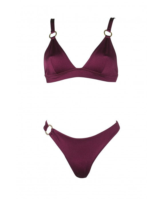 Bikini en color burdeos satinado super favorecedor que realza mucho el bronceado. El tejido italiano es super agradable y de maxima calidad.